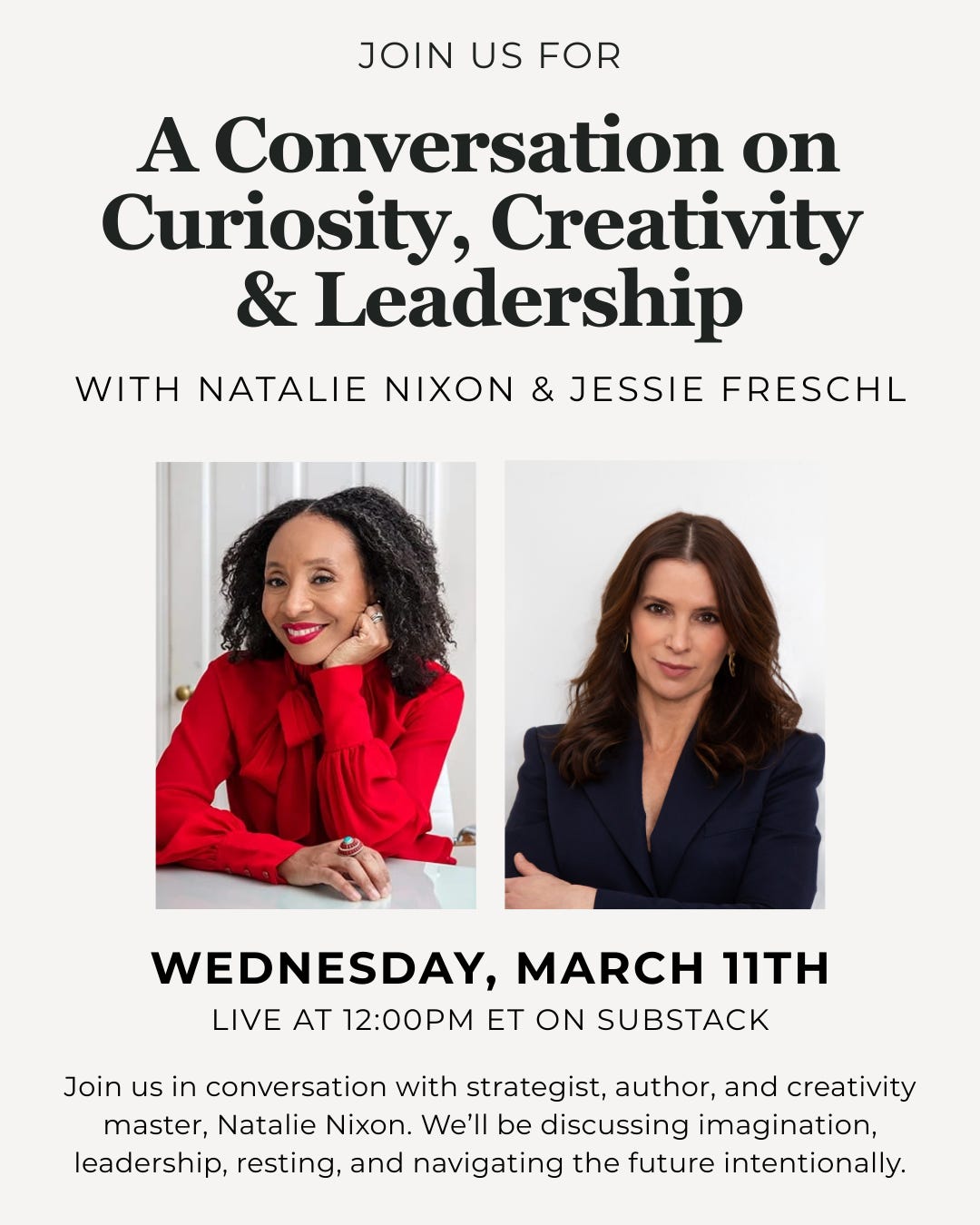 Tomorrow at noon, strategist superstar and creativity master Natalie Nixon is joining Jessie Freschl at Repurpose for a conversation on curiosity, leadership, and all the things.